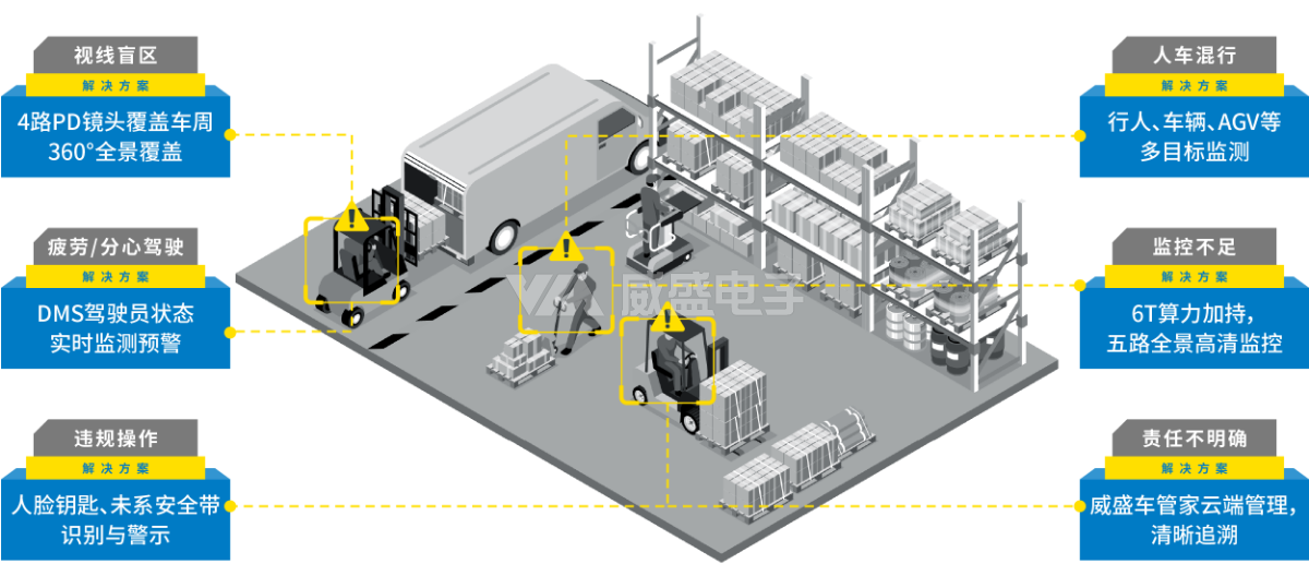 威力智能 M168Pro 叉车AI安全监控套件基于威盛先进AI技术,集成五路1080P高清AI监测与6T充沛算力,实现全景监控与智能分析。系统支持最远10米监测范围,可智能识别行人、车辆、栏杆及AGV等目标,并可集成货叉称重、人脸钥匙、智能控车等高级功能。兼容主流车型,可通过威盛车管家云平台统一管理,全面提升叉车作业安全与效率。